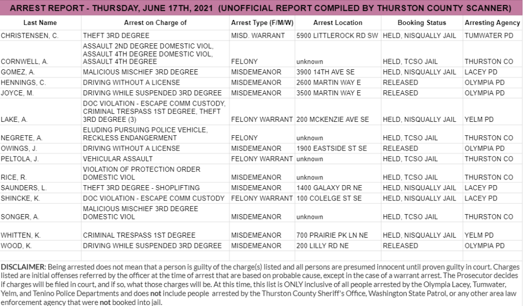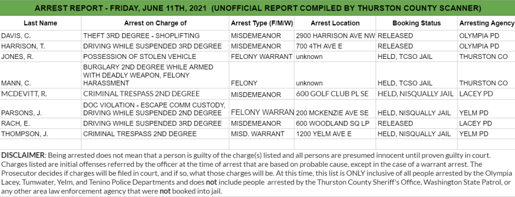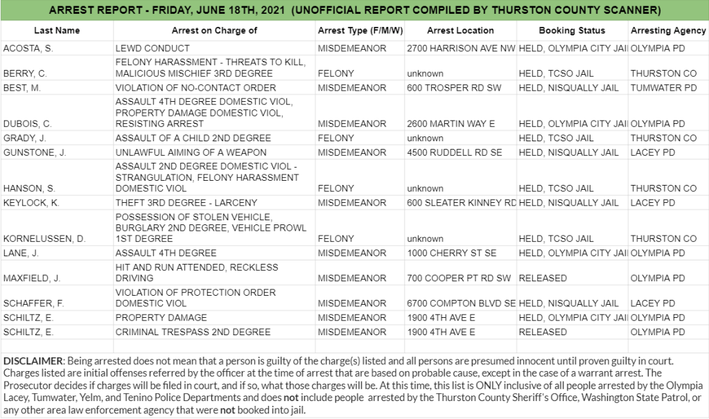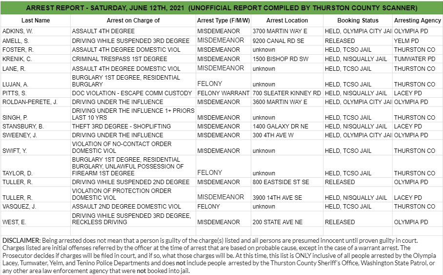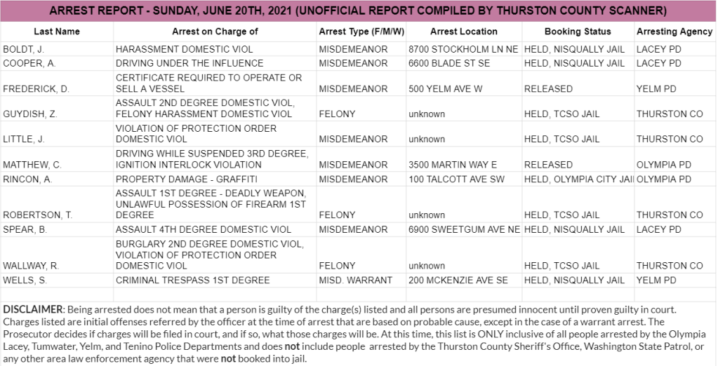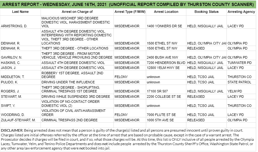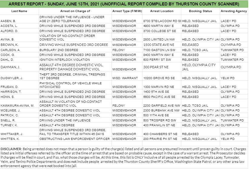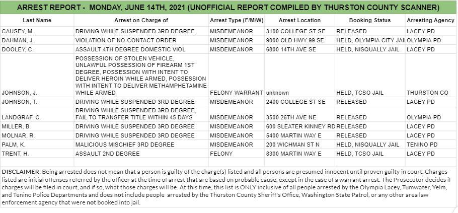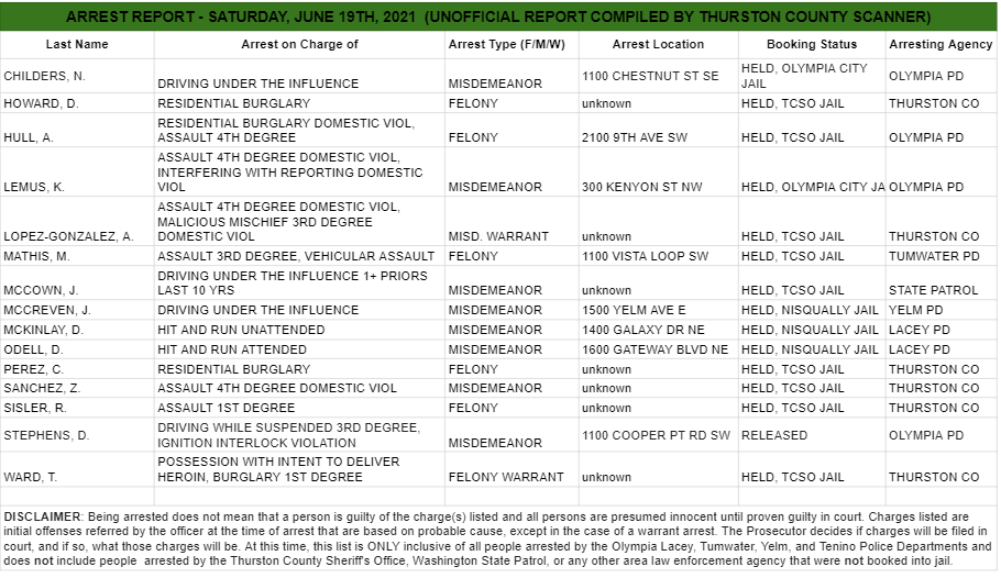 The Arrest Report is now available for Sunday, June 20th, 2021. Agencies in Thurston County made 3 felony arrests, 7 misdemeanor arrests, and 1 warrant arrests (0 felony, 1 misdemeanor) for a total of 11.