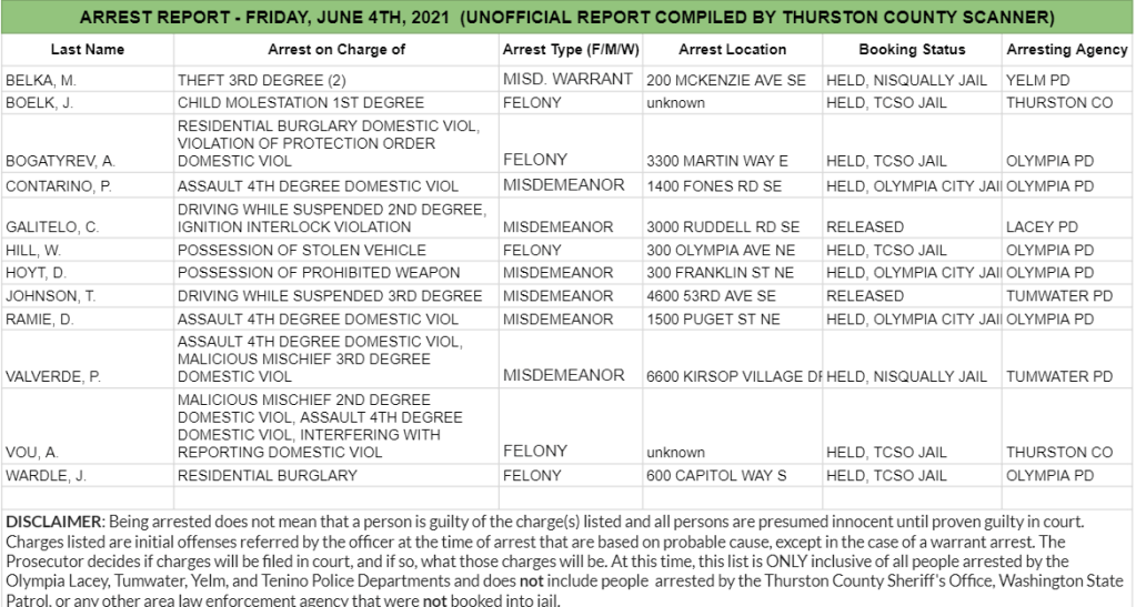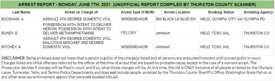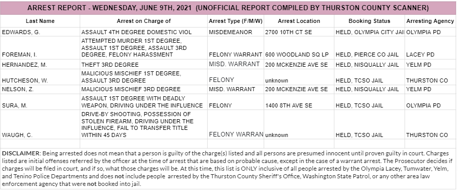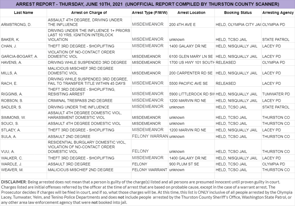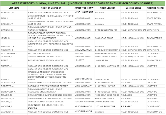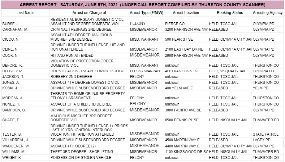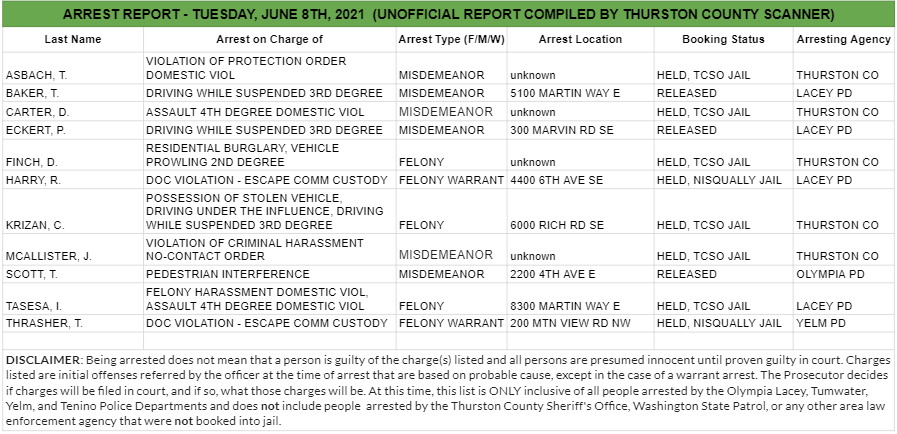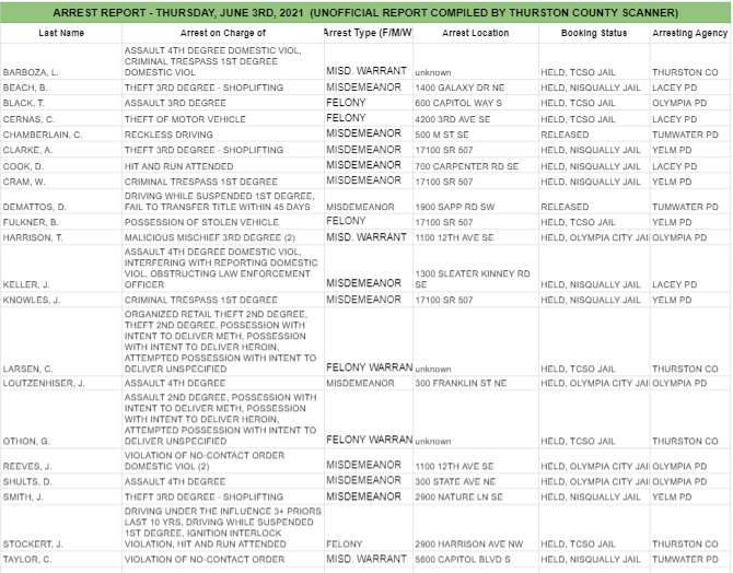 The Arrest Report is now available for Thursday, June 10th, 2021. Agencies in Thurston County made 2 felony arrests, 14 misdemeanor arrests, and 2 warrant arrests (2 felony, 0 misdemeanor) for a total of 18.